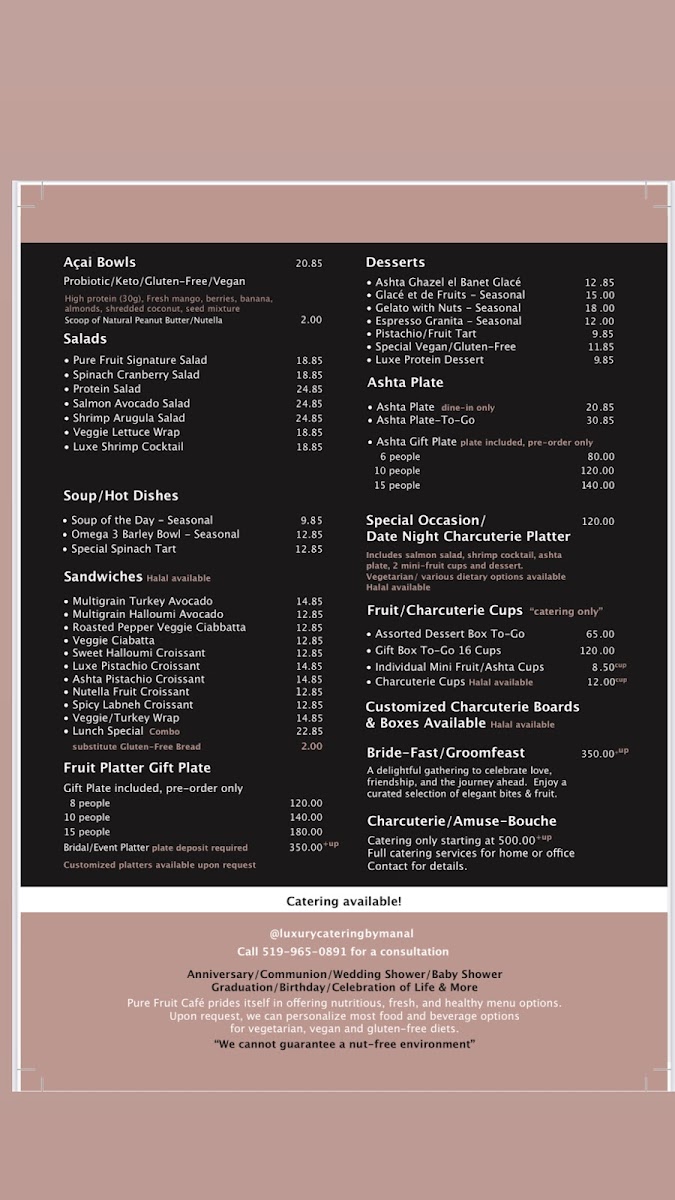 Welcome to Pure Fruit Café, a delightful culinary destination nestled in Windsor, Ontario. This cozy café combines an inviting atmosphere with a unique twist of Arabic charm and French flair. Pure Fruit Café is not just a place to grab a bite; it’s an experience. Dive into our vibrant menu featuring mouth-watering options like the Salmon Bowl Cocktail and the satisfying Acai bowl, perfect for a quick lunch or a study break.